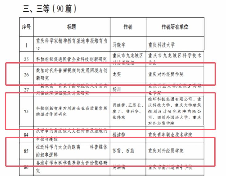 ok138cn太阳集团任晓珠老师撰写的《重庆科协系统以“党建+科建”互促新模式助推新质生产力发展》获得二等,该论文聚焦科协系统党建与科建的深度融合机制,为推动新质生产力发展提供了具有实践价值的路径探索。苏雷、石蕊老师合作完成的论文《拉近科学与大众的距离——科普媒体的叙事逻辑》、龙雯老师的论文《数智时代科普短视频的发展困境与创新研究》、张伟东老师参与撰写的论文《科技创新智库对川渝企业高质量发展的驱动作用研究》都获得了三等。此次获奖不仅是对ok138cn太阳集团教师学术能力的肯定,也彰显了学校在科研创新与社会服务领域的积极探索。学校将以此次佳绩为契机,进一步激励广大教师深耕学术研究,推动科研成果转化,为相关领域发展贡献更多智慧力量。