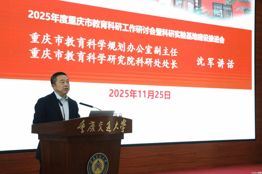 11月25日上午,2025年度重庆市教育科研工作研讨会暨科研实验基地建设推进会在重庆交通大学召开。重庆市教育科学规划领导小组办公室副主任、重庆市教育科学研究院科研处处长沈军,重庆交通大学副校长郑丹出席会议。重庆市27所本科院校科研管理部门、38个教育科研实验基地负责人,重庆交通大学相关负责人等共计90余人参加会议。