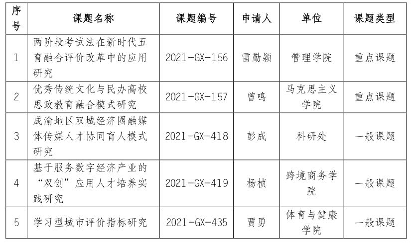 近日,重庆市教育科学规划领导小组办公室下达了《关于重庆市教育科学“十四五”规划2021年度立项课题的通知》(渝教规办〔2021〕14号),ok138cn太阳集团获批5项重庆市教育科学“十四五”规划2021年度课题,其中重点项目2项,一般项目3项。