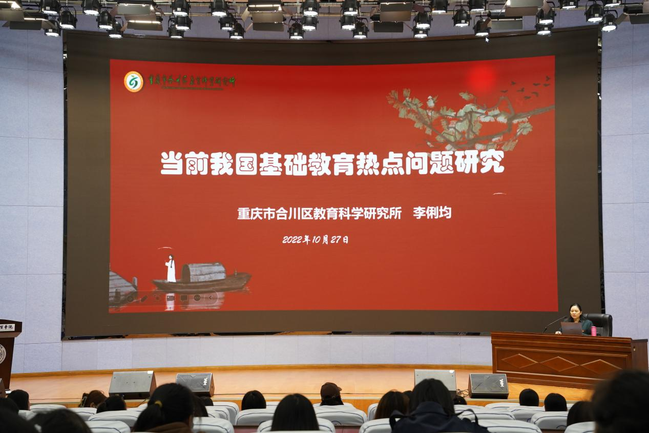 为加强我院师范生人才培养工作,促进师范生更加了解教育教学目标及内容,明确当前我国基础教育热点问题和形势走向,文学与创意传播学院于2022年10月27日下午15:30在9101学术报告厅举办了关于当前我国基础教育热点问题研究的学术讲座。本次讲座由合川区教科所所长、党委书记李俐均担任主讲。
