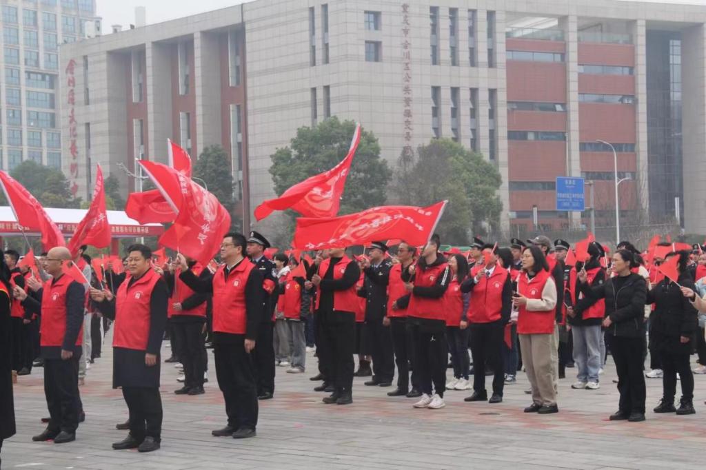 舞蹈表演、朗诵、颁奖等流程为活动拉开了帷幕。由各岗位30多名优秀志愿者代表入场,24支志愿者服务队边唱着《学习雷锋好榜样》,边踏着整齐的步伐入场。当全员到齐,播放《这就是合川》的歌曲,各志愿队伍旗手挥舞着大旗帜,志愿者挥舞着小红旗,一面面红旗在空中飘扬,在挥动中传递了雷锋精神。当蓝天救援队队长杨志剑在台上用他洪亮的嗓音,讲述自己与队员奔赴土耳其地震现场参与联合救援的故事时,让我们感受到了蓝天救援队的英勇和大爱,也让土耳其人民感受到了中国红的温暖,正是他们诠释了“大爱无国界”的精神。