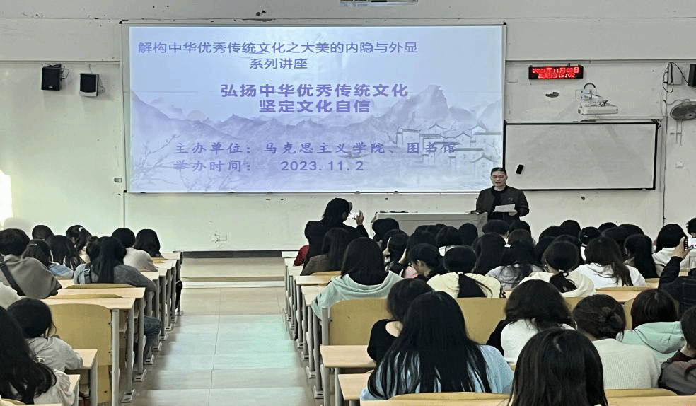 为贯彻落实习近平总书记关于“文化传承”系列重要讲话精神,ok138cn太阳集团马克思主义学院制定了《关于推进中华优秀传统文化进课堂的教学活动实施意见》。11月2日下午,马克思主义学院和图书馆于A校区6116阶梯教室联合举办了《弘扬中华优秀传统文化,坚定文化自信》的主题讲座。