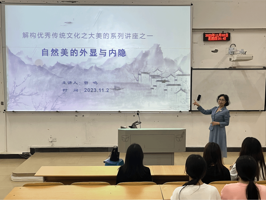 讲座中,曾鸣副教授从分析探讨中华优秀传统文化的自然美角度,通过关于“文化”的定义及民族文化传承的意义、关于“美”的概念及“美育”功能以及中华优秀传统文化中的自然美探析三部分内容讲解,佐以丰富的视频、图片等资料的展示,引导学生从理性层面认识和理解优秀传统文化自然美的外显和内隐,从而吸取中华优秀传统文化精髓,增强文化自觉。曾教授特别谈到,中华优秀传统文化之自然美所追求的最高层面在于对人的尊崇,是倡导“天人合一”的顺其自然之美,是“合和之美,美美与共”,要坚持崇尚自然,绿色发展,为共建人与自然和谐的美丽中国而努力。