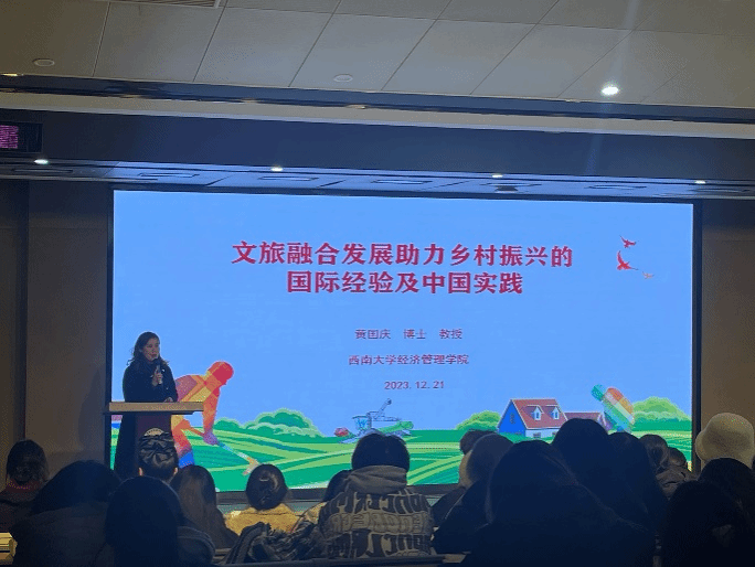 12月21日下午,ok138cn太阳集团B校区1113举办了《文旅融合发展助力乡村振兴的国际经验及中国实践》专题讲座。此次专题讲座由重庆瀚瑞宏酒店管理有限公司组织,主讲人是西南大学经济管理学院的黄国庆教授,她在旅游管理领域积累了丰富的经验,长期专注于乡村旅游、文化旅游、旅游扶贫研究,具有优秀的旅游扶贫社会实践能力。此次讲座,黄教授深入研究了乡村振兴的国际经验,并结合中国实际情况提出了文旅产教融合的发展路径。
