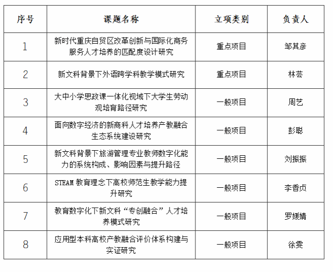 近日,重庆市高等教育学会公布了高等教育科学研究项目立项通知,学校8项高等教育科学研究课题立项。邹其彦《新时代重庆自贸区改革创新与国际化商务服务人才培养的匹配度设计研究》、林芸《新文科背景下外语跨学科教学模式研究》获重点课题。
