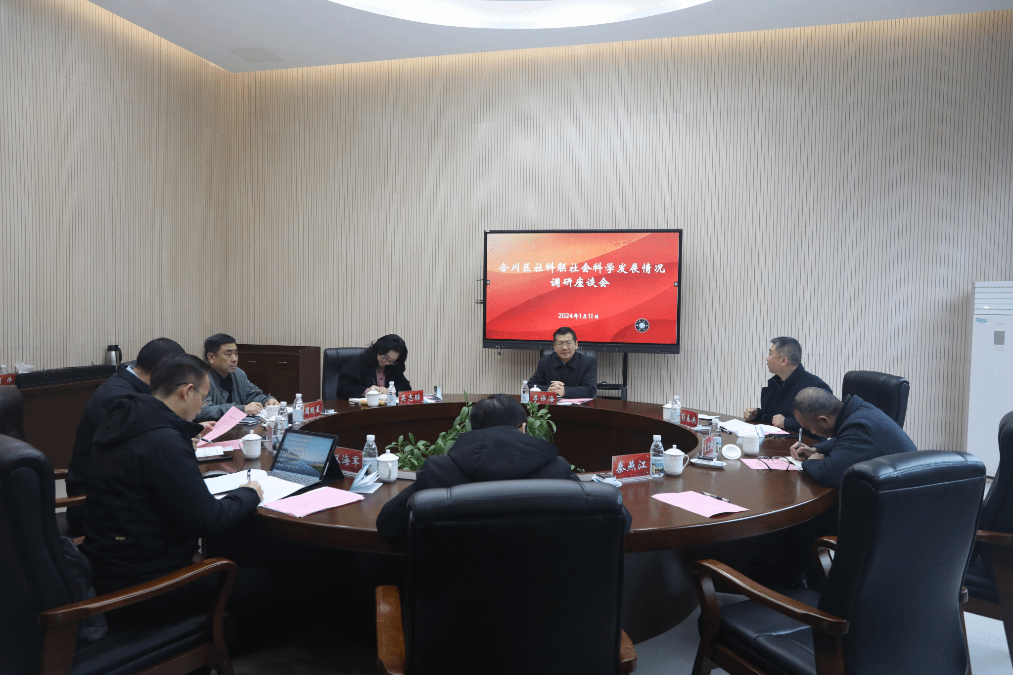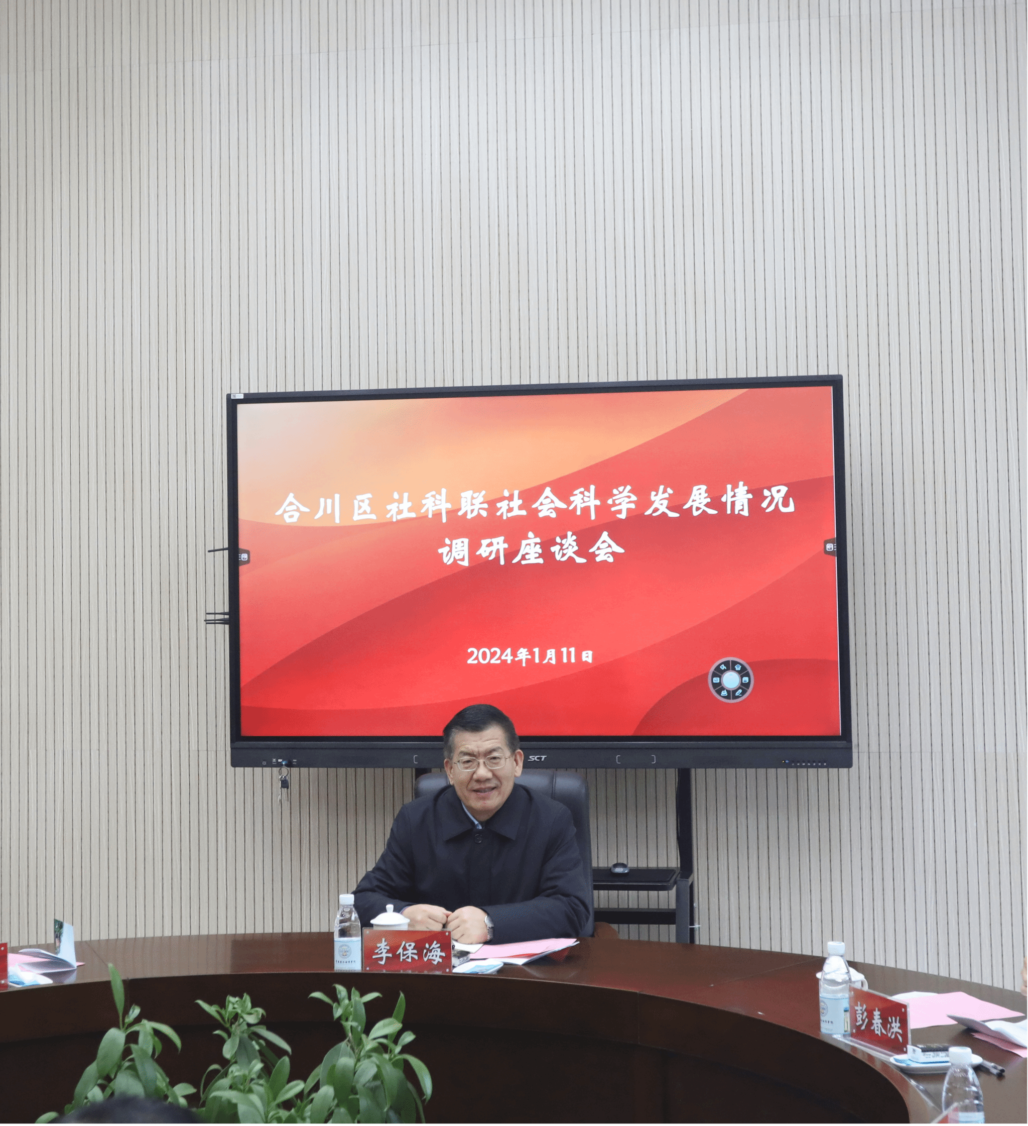 2024年1月11日,重庆市社科联党组书记、副主席李保海一行来ok138cn太阳集团调研并出席合川区社会科学发展情况调研座谈会。