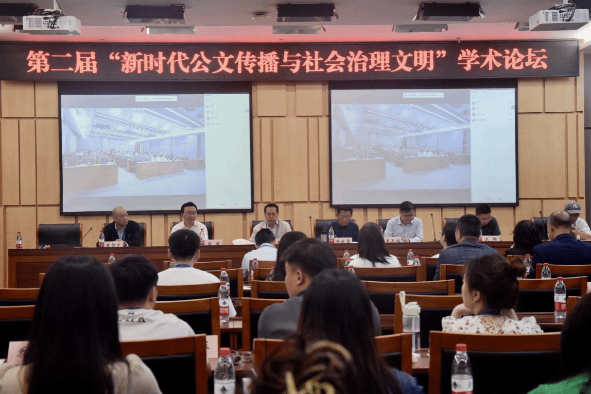 彭成教授主持大会主题发言环节,田义贵教授进行《电影外文本传播及行业治理》主题发言,黄文贵副教授在分论坛上担任点评专家。与会专家学者围绕“公文媒介在基层社会治理文明中功能与价值研究“公文传播学学科建构与学理路径研究”“ 新时代公文传播与社会治理文明的学科教育研究”等话题进行了广泛、深入的交流与探讨,取得了卓有成效的学术交流成果,会议推动了公文传播学这一新兴交叉学科的发展和深入研究,彰显了公文传播对社会治理文明建设的价值和意义。八个分论坛上,38位专家学者和研究生进一步就新时代公文传播与.社会治理文明的学术话题做了深入研讨,融合了公文学、传播学、社会学、哲学、管理学、文化学、伦理学、语言学、修辞学等多个学科领域的知识与理念,涉及联合国公文国际治理、古典管理学公文、政务微信公众号公文、政务直播公文、微信公文、乡村振兴、政府形象构建等诸多话题,展开了精彩的观点交锋,为新时代的公文传播学研究带来了新的思考。