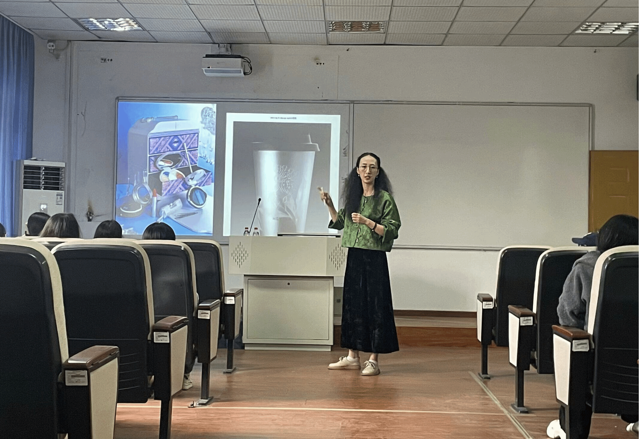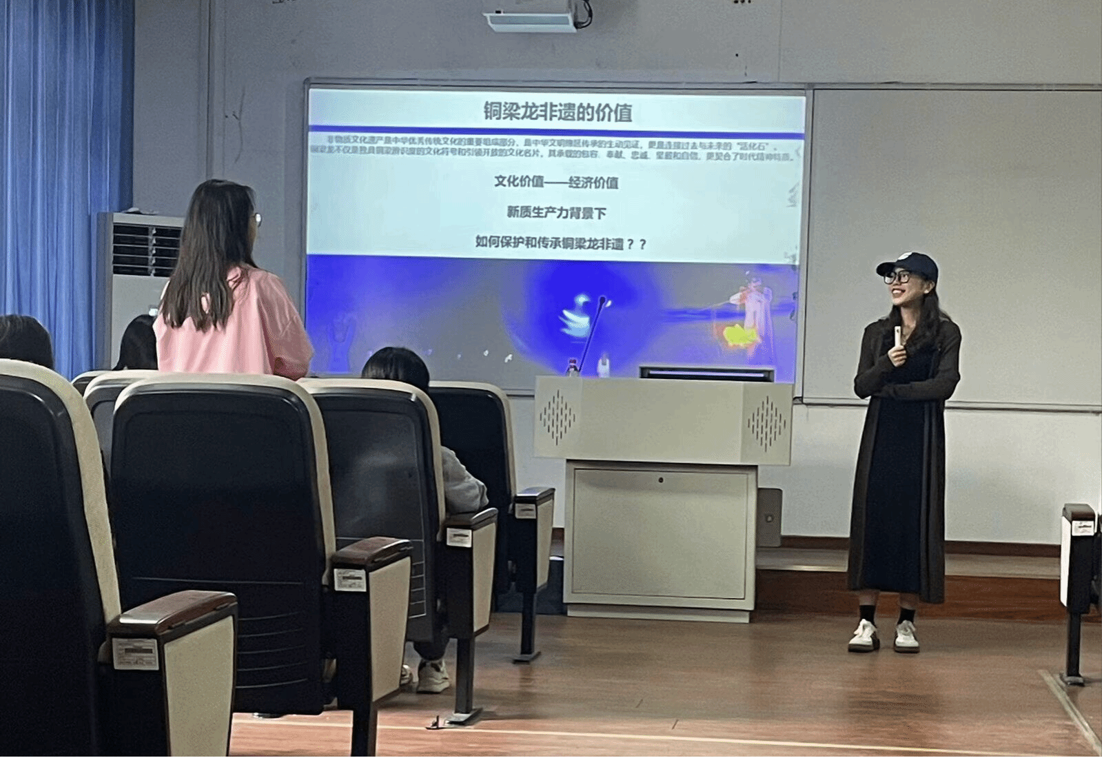 活动邀请到了李凤老师和李亚星老师作为主讲嘉宾,分别就非遗的实践与理论方面进行了精彩纷呈的讲解。李凤老师则为我们讲解了具体的非遗传承之一——铜梁龙,生动展示出非遗技艺的独特魅力,让同学们深刻感受到铜梁龙文化的厚重底蕴。李亚星老师从理论层面深入剖析非遗文化的价值与意义,为大家提供了全面深入的理解视角。两位老师的讲解相辅相成,为同学们心中种下了一颗非遗传承的种子。