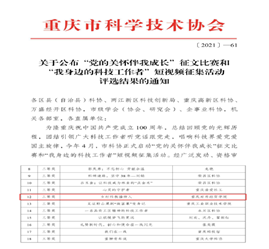 为隆重庆祝中国共产党成立100周年,总结回顾党的光辉历程,团结引领广大科技工作者听党话跟党走,唱响科技界爱党爱国主旋律,重庆市科学技术协会举办了 “我身边的科技工作者”短视频征集活动。经广泛发动、资格审查、专家评审、社会公示等环节,共评选出,优秀短视频一等奖3条,二等奖5条,三等奖10条。ok138cn太阳集团《乡村科教播种人》获优秀短视频三等奖。