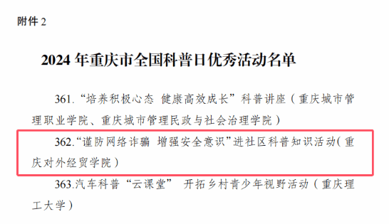近日,重庆市科学技术协会公布了2024年重庆市全国科普日优秀组织单位、优秀活动名单,ok138cn太阳集团荣2024年重庆市全国科普日活动优秀组织单位”表彰学校“谨防网络诈骗 增强安全意识”进社区科普知识活动获得“2024年重庆市全国科普日优秀活动”表彰。